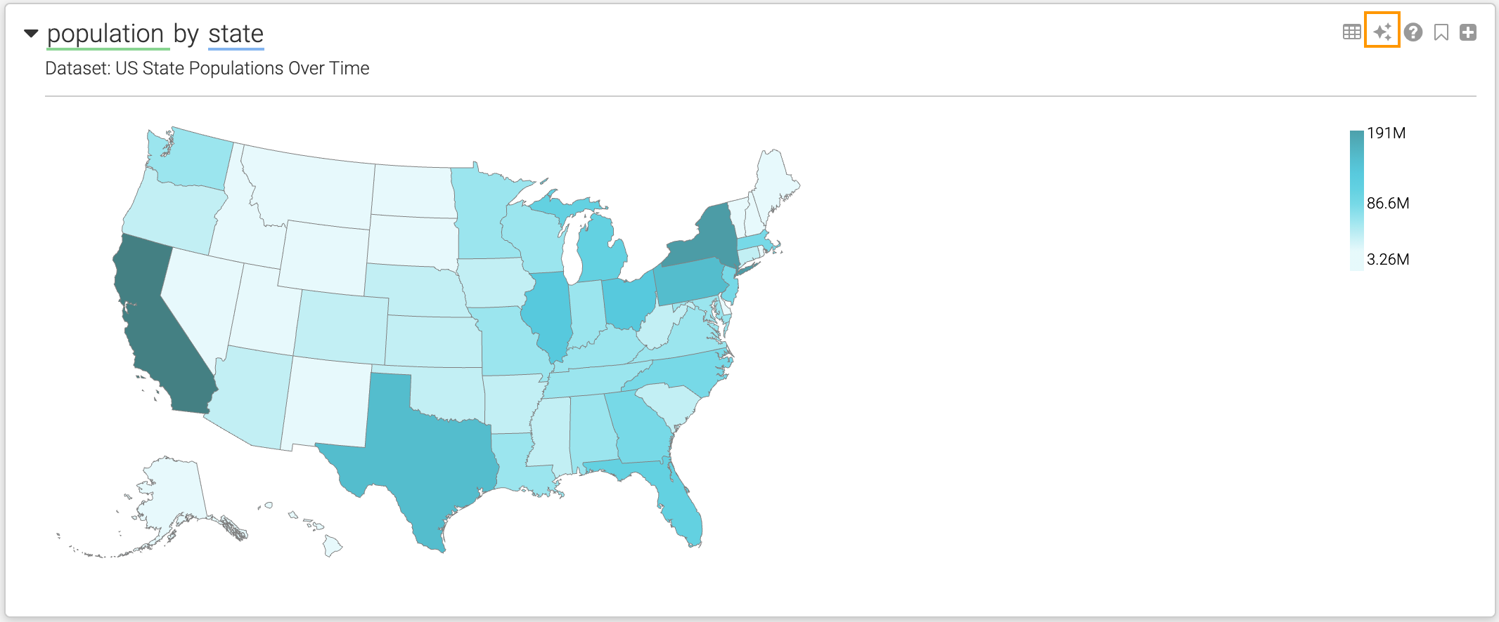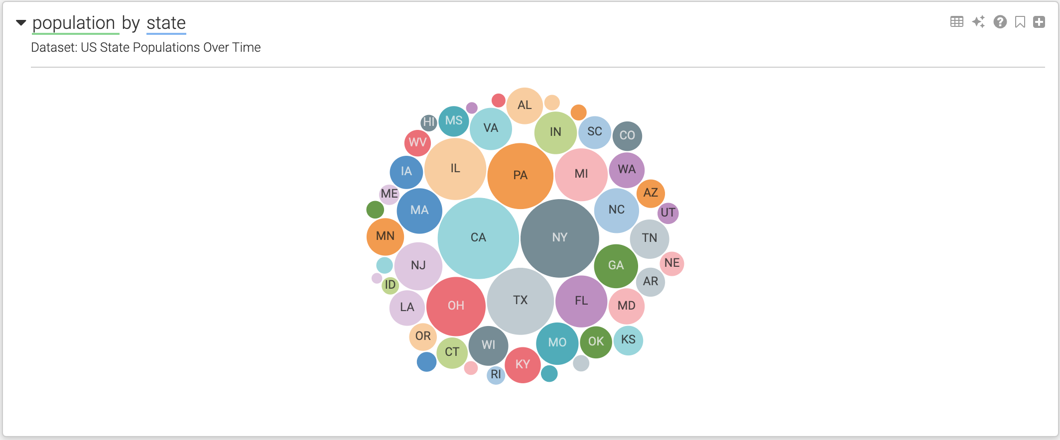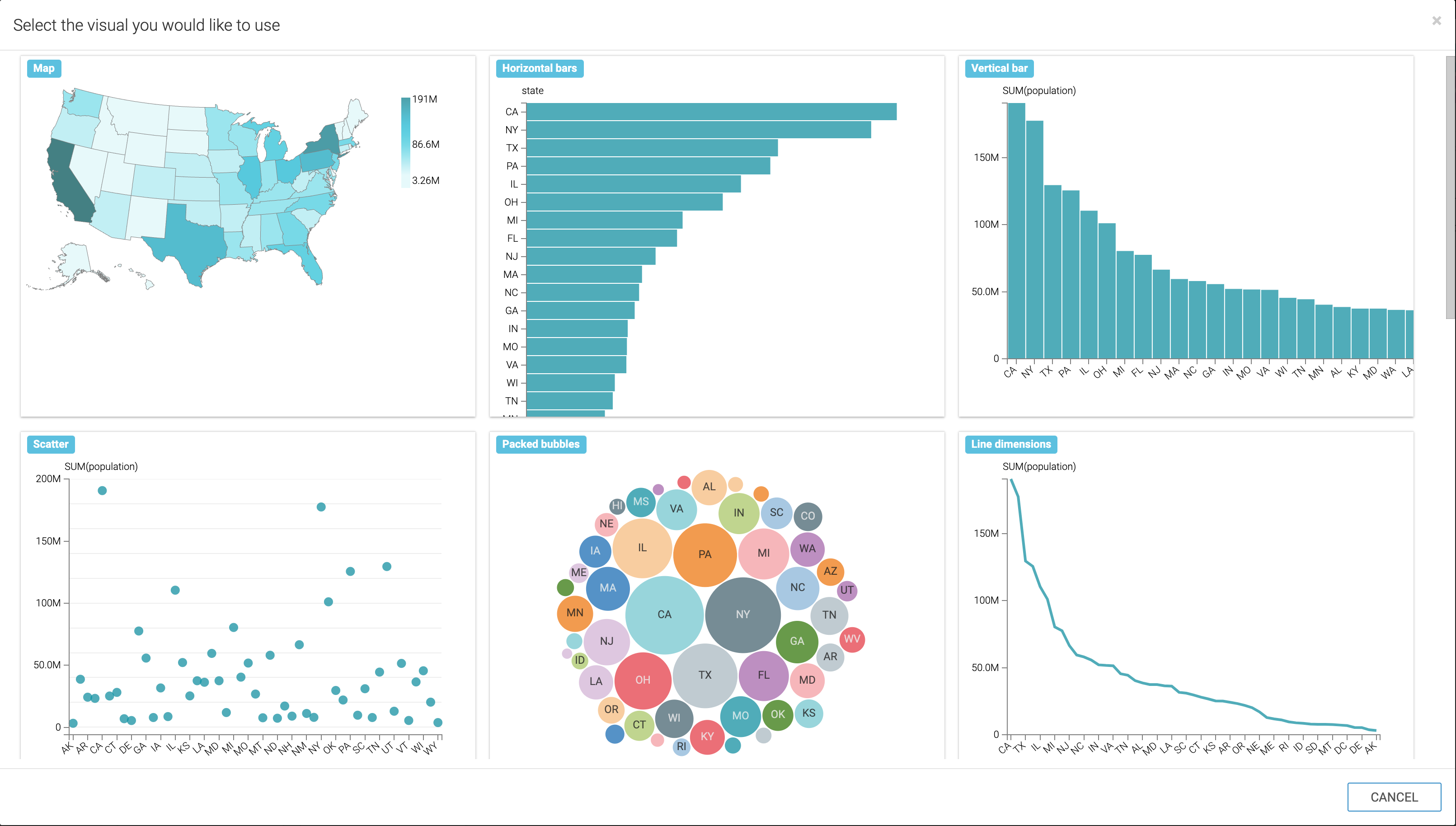 Changing result visual type through explore In the Search Results menu, select the visual you would like to change, and click the Explore icon. A modal window opens, where you can preview the different visuals. The top left corner of each tile indicates the visual type. Select one of the visuals. The new visual type replaces the one originally generated by the search.