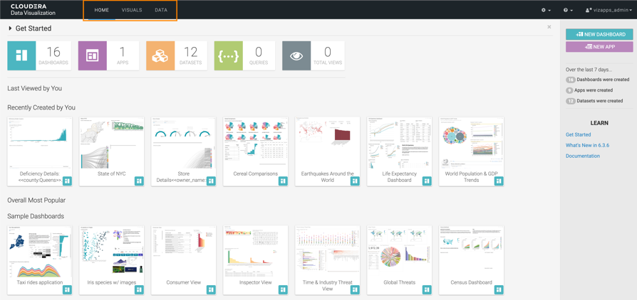 The web interface of Data Visualization has three views: HOME, VISUALS, and DATA. When you log in, you land on the homepage (HOME view) where the menus that you can find on the Main navigation bar enable you to access the other two interfaces.