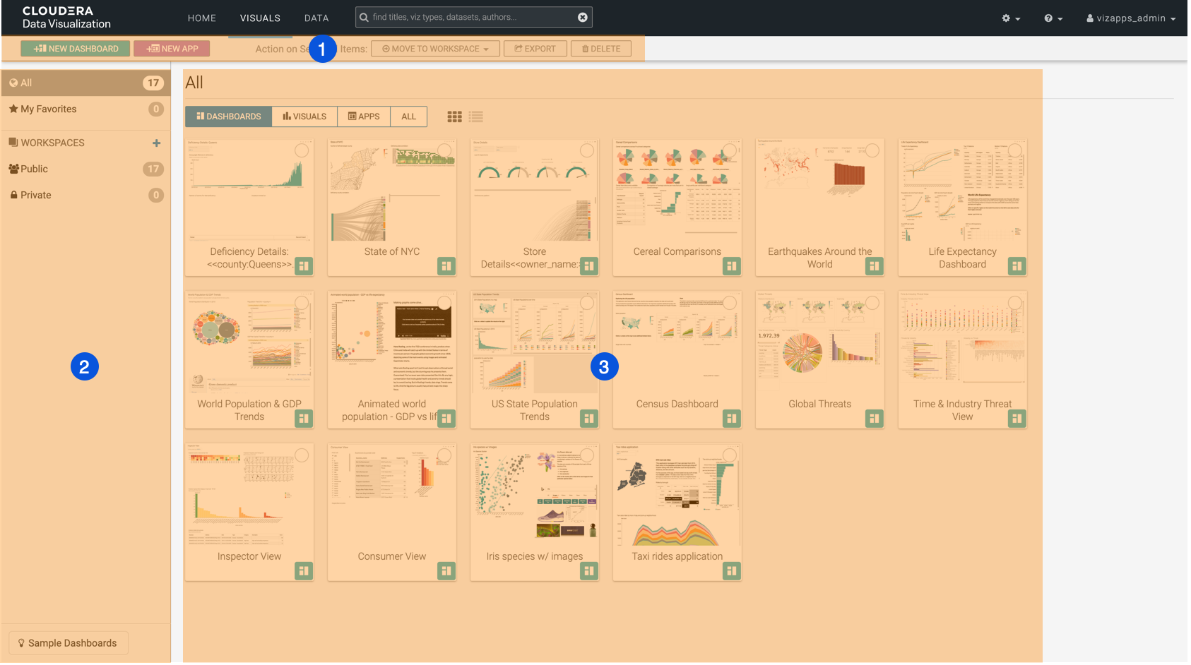 The Sample Dashboards button gives you access to examples available in CDP Data Visualization.