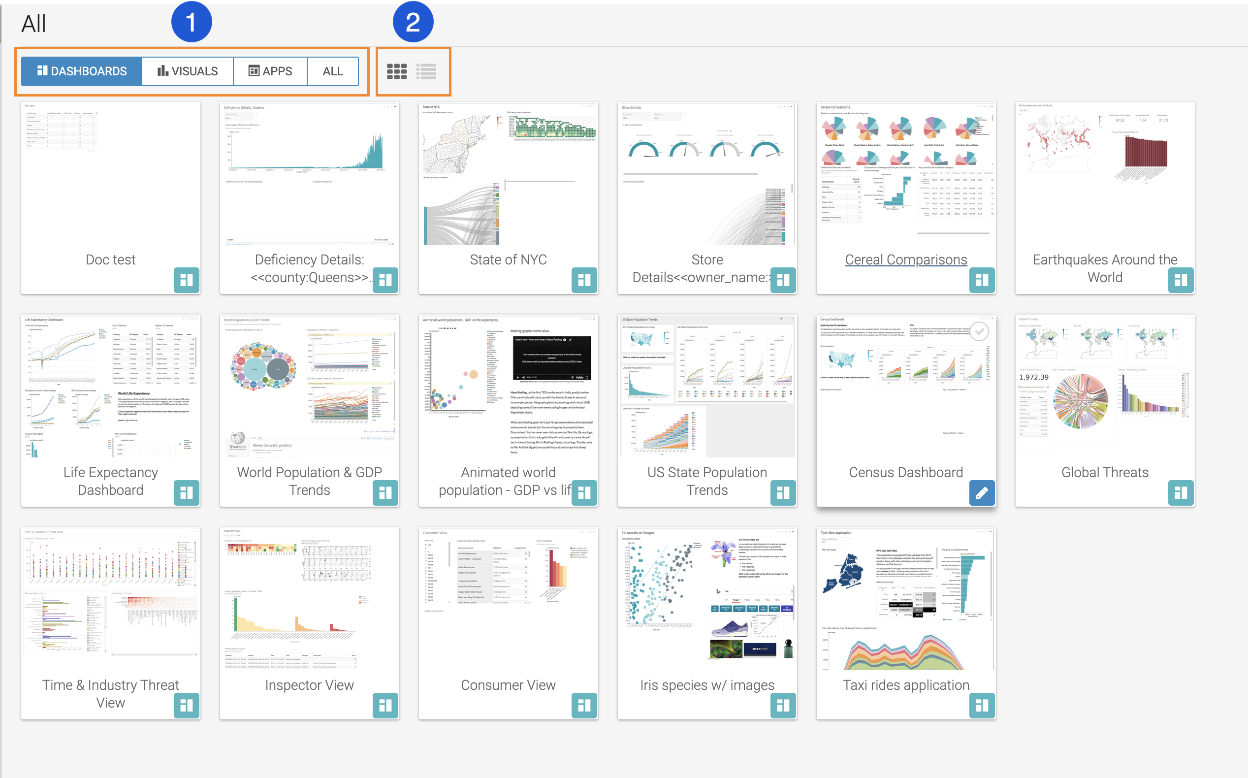 These two icons allow you to switch between Grid View and List View. Grid View shows you thumbnail previews of your visuals, dashboards, and applications, while List View presents the same items vertically arranged as a single, continuous, multiple-line list.