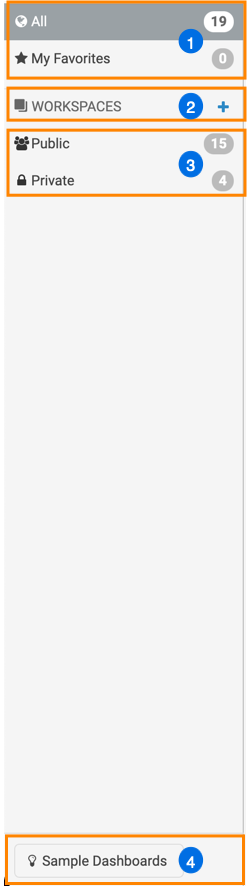 Under WORKSPACES, you can see the default workspaces that are available: Private and Public. If you create a custom workspace, it is added to this side menu bar under Private. The number next to each workspace shows you how many dashboards are available in the workspace.