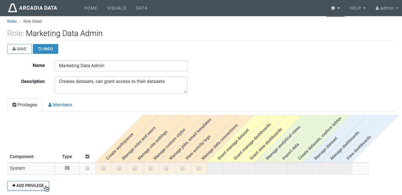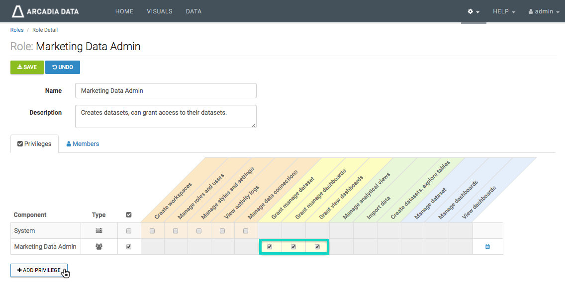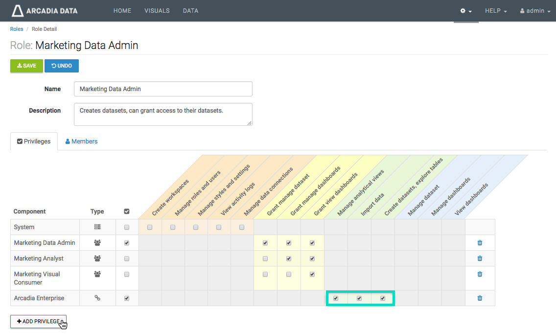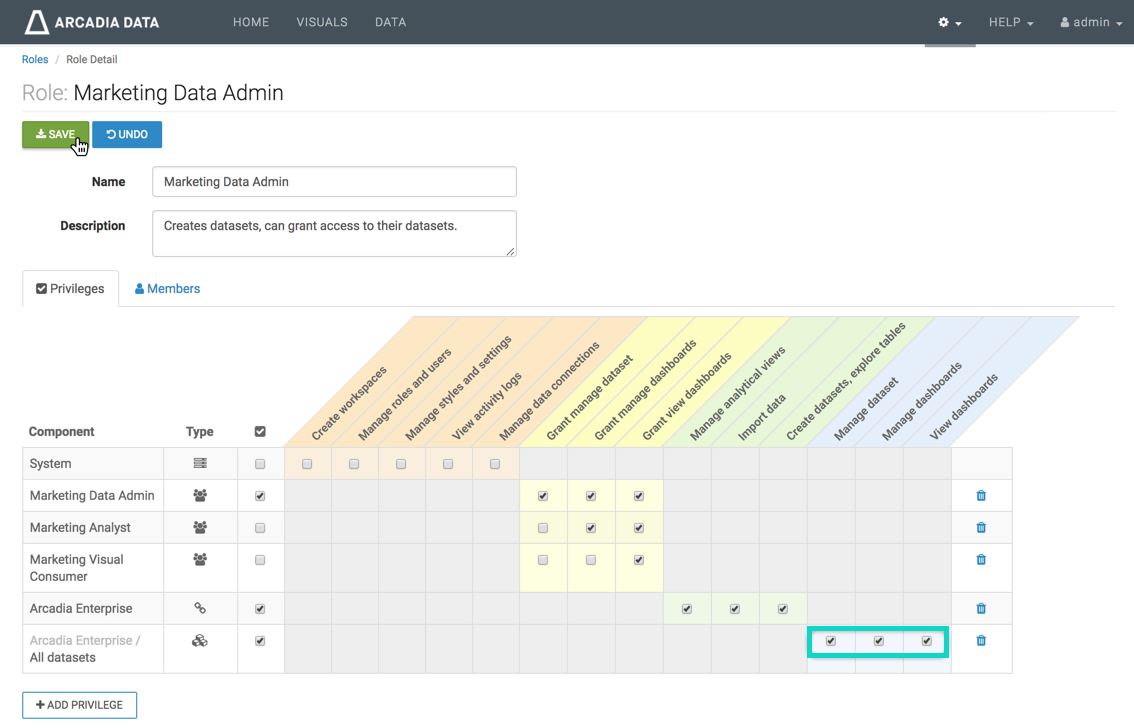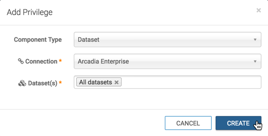 Finally, we declare dataset-level privileges. We can choose previously declared connections and limit access to a few of its datasets, or select a new connection, or choose all datasets on a connection. Here, we simply let members of the Marketing Data Admin role access all existing datasets on the Arcadia Enterprise connection.