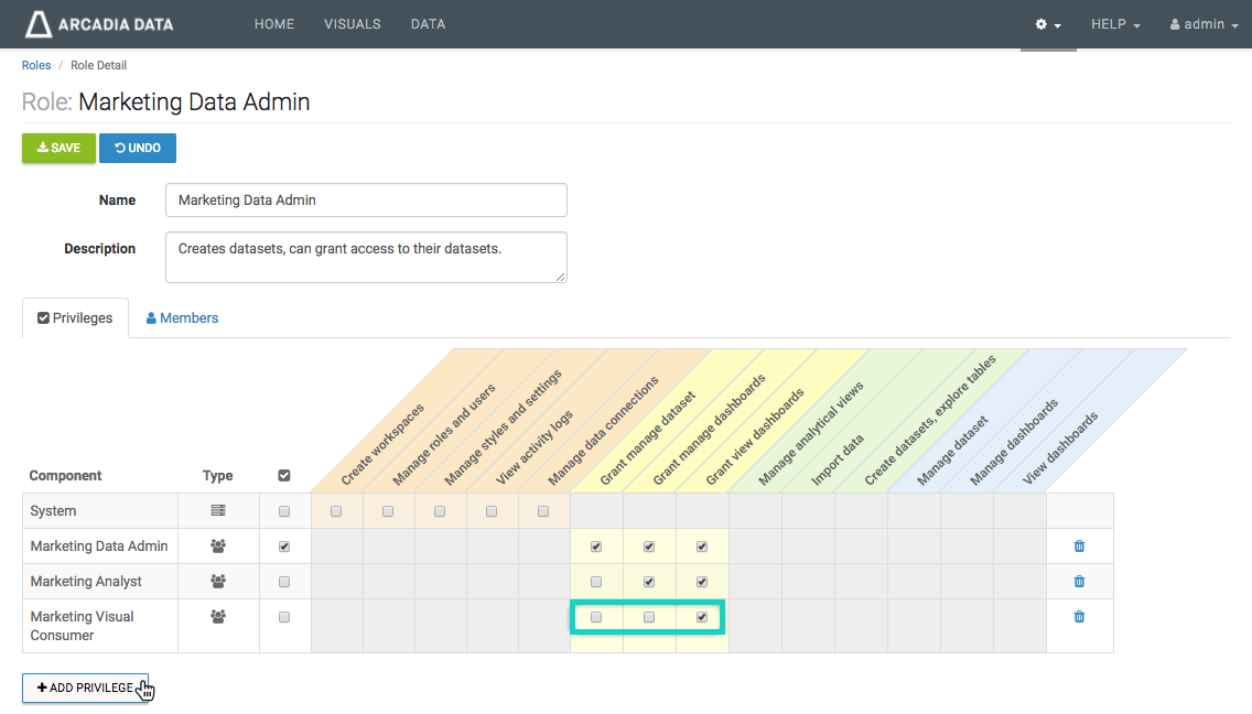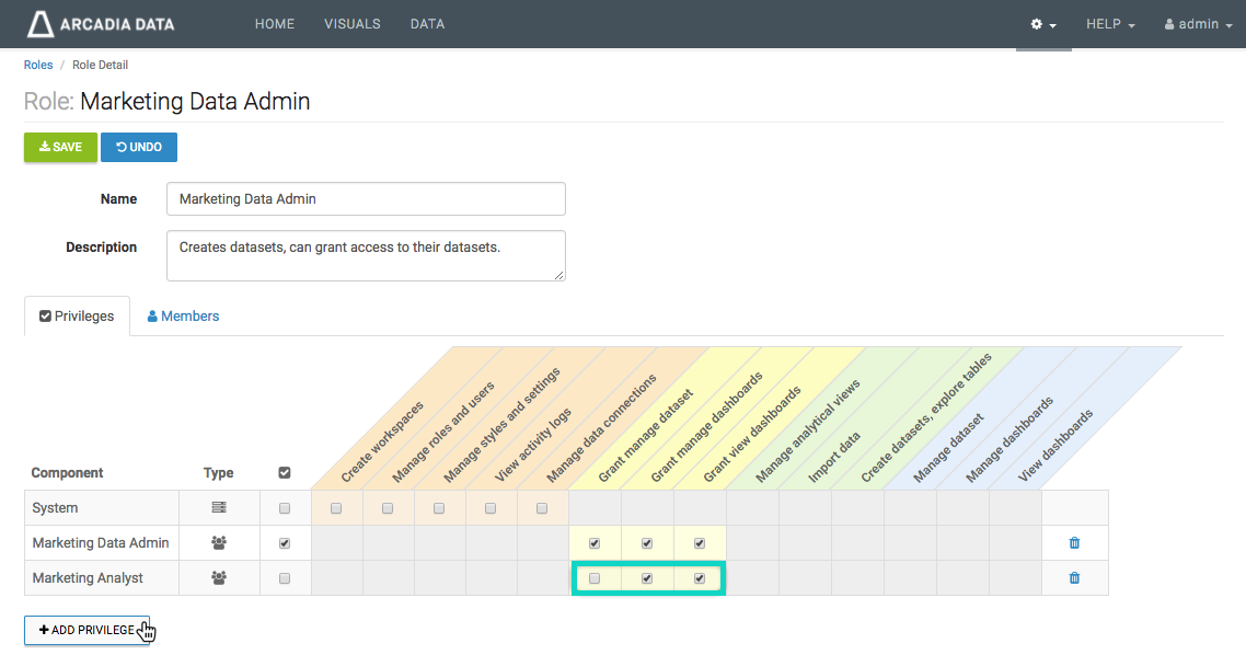 Table 1. Privileges assigned to the Data Admin roles Role Name Component Permission Marketing Data Admin Role: Marketing Data Admin - Grant manage dataset