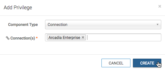 - In the Add Privilege modal window, create the connection-level privileges necessary for the Marketing Data Admin user. This particular privilege enables access to all data available through the specified connection.