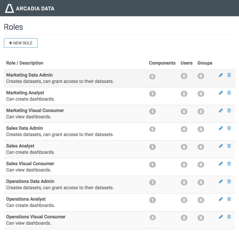 We already created three (3) dataset publishing roles (data admins) in Setting the dataset recipient roles, one each for the three organization groups: Marketing, Sales, and Operations. These are Marketing Data Admin, Sales Data Admin, and Operations Data Admin, respectively. We also created the roles for the recipients of the grants, the analysts and the visual consumers.