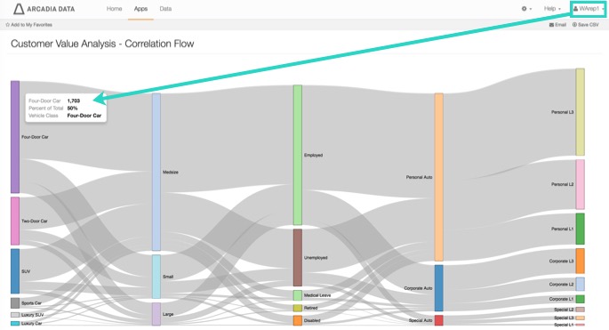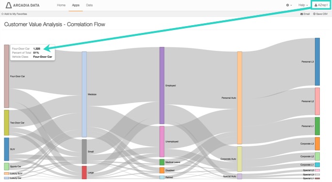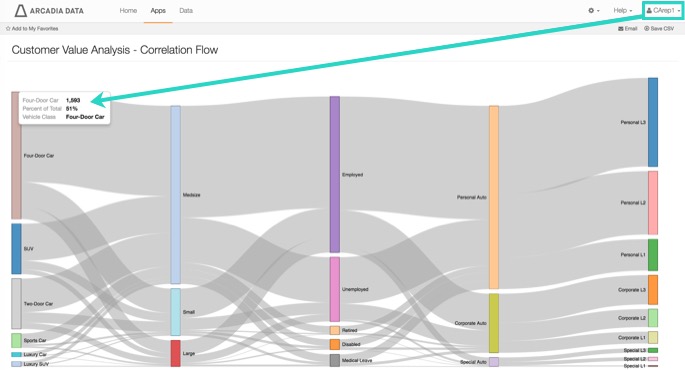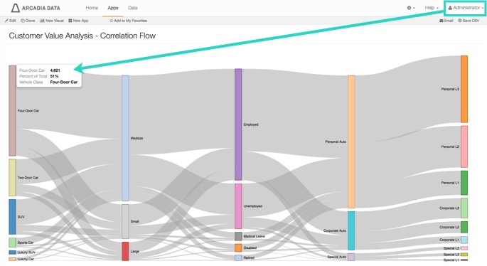 1. Log in as a user with Administrative privileges, and navigate to the application. Notice that the entire dataset appears in the visual; for example, it shows 4,621 Four-Door Cars.