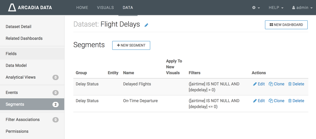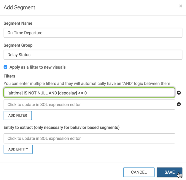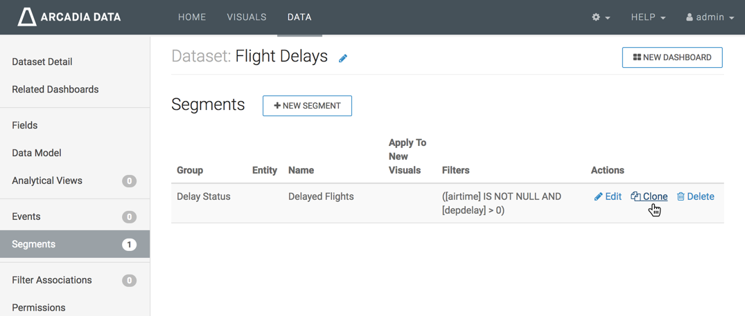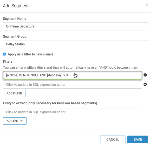 In this example, we are cloning Delayed Flights to create a new segment On-Time Departure.