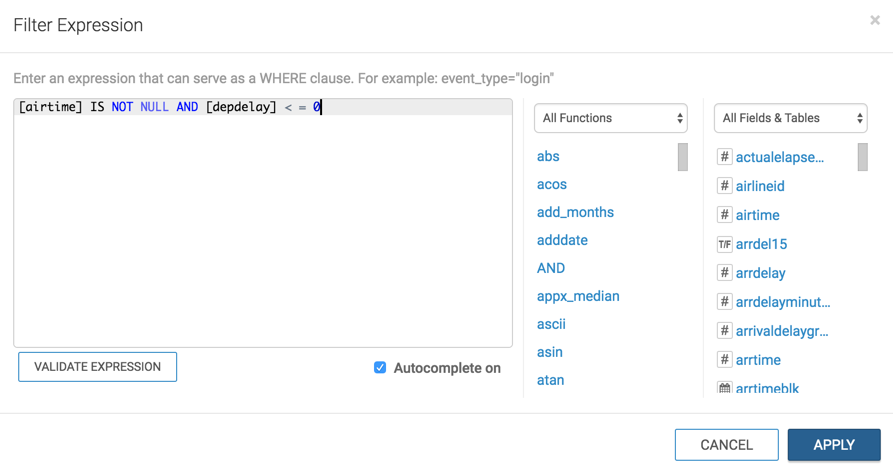 [airtime] IS NOT NULL AND [depdelay] < = 0 - Optional: