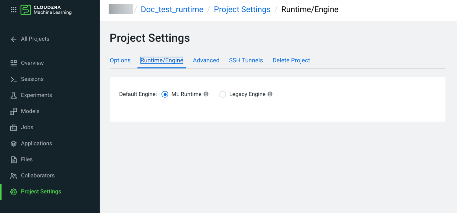 Setting ML Runtime as engine in a CML project Learn how to define ML Runtime as the default engine in your Cloudera Machine Learning (CML) project. On the left navigation bar, click Projects.Click the project where you want to set ML Runtime as the default engine type.Open Project Settings from the left navigation bar and click the Runtime/Engine tab.Select ML Runtime. Create Data Visualization application using ML Runtime Parent topic: Setting ML runtime as default engine in CML