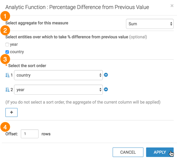 Under Select entities over which to take % difference from previous value, select country. This is the grouping that applies when calculating the % difference from previous values.