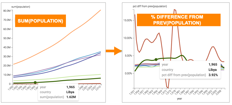 sum(population)in millions topopulationas a percentage difference from previous value.Hover over any country to view the percentage difference of population from the previous year. In the following example, the tooltip shows an increase in the population of Libya from previous year 1964 to the current year 1965 by 3.92%.