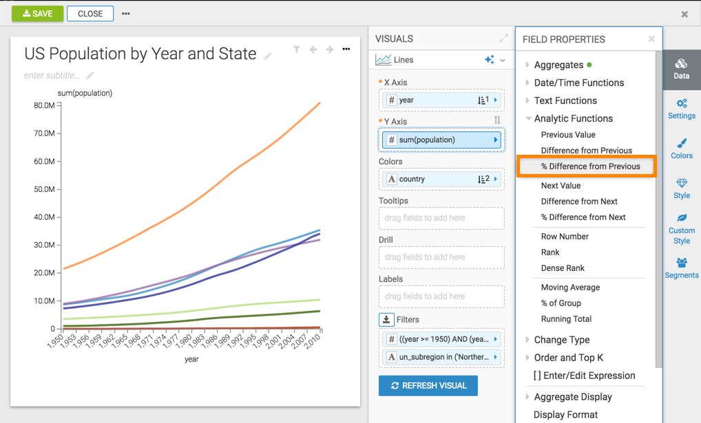 This article describes how to use the Percent Difference from Previous Value analytic function in CDP Data Visualization.