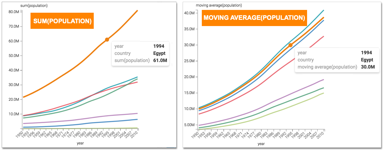 avg(sum([population])) over (partition by [year] order by [year], [country] rows between 2 preceding and 2 following) as 'moving average(population)' -