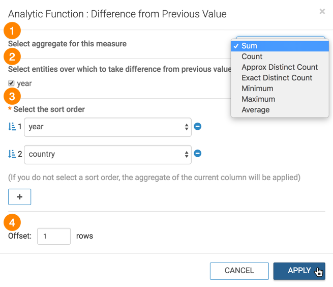 Under Select the sort order, you can specify the order of sorting. This order specifies what the previous row is, and the row where the value is taken. If your visual already specifies sorting order, these values appear in the modal.