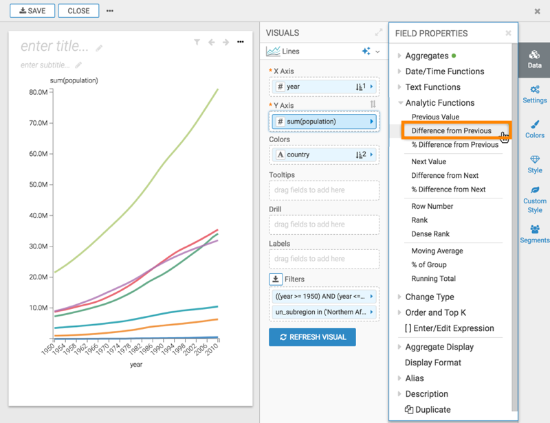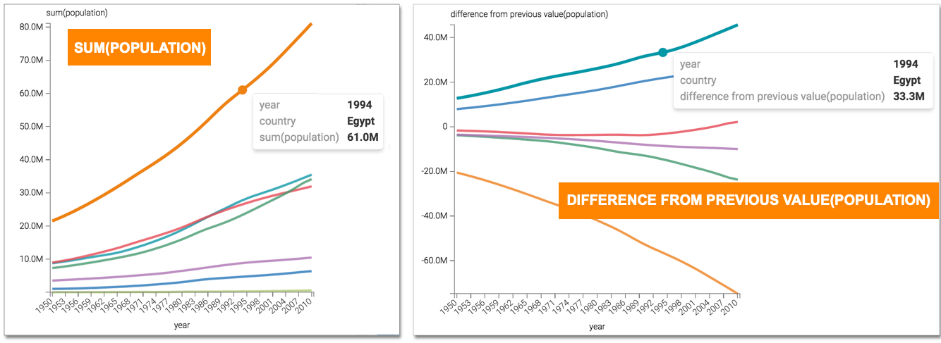 sum([population]) - LAG(sum([population]), 1) over (partition by [year] order by [year], [country]) as 'difference from previous value(population)' -