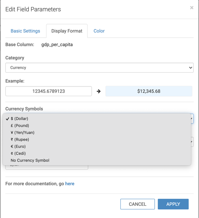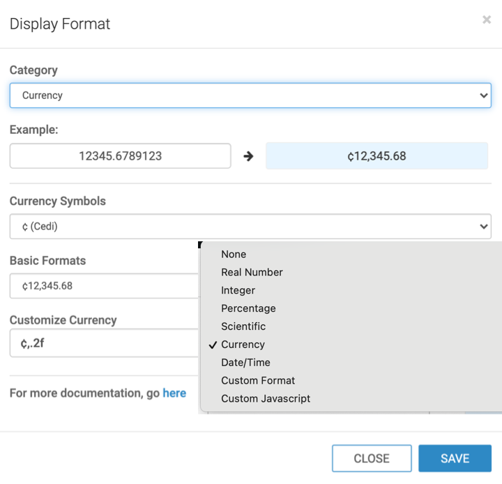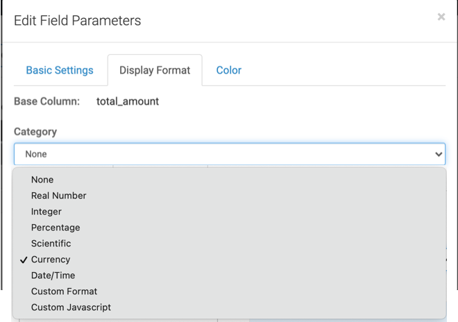 Follow these steps to continue configuring a field at the dataset level for currency format. See Changing the field display format for the initial navigation steps.