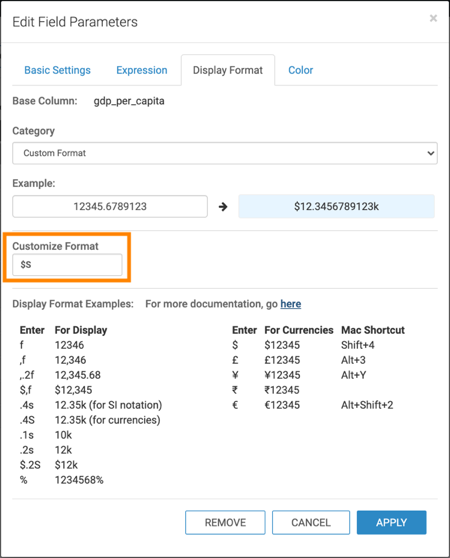 Follow these steps to continue configuring a field at the dataset level for custom format. See Changing the field display format for the initial navigation steps.