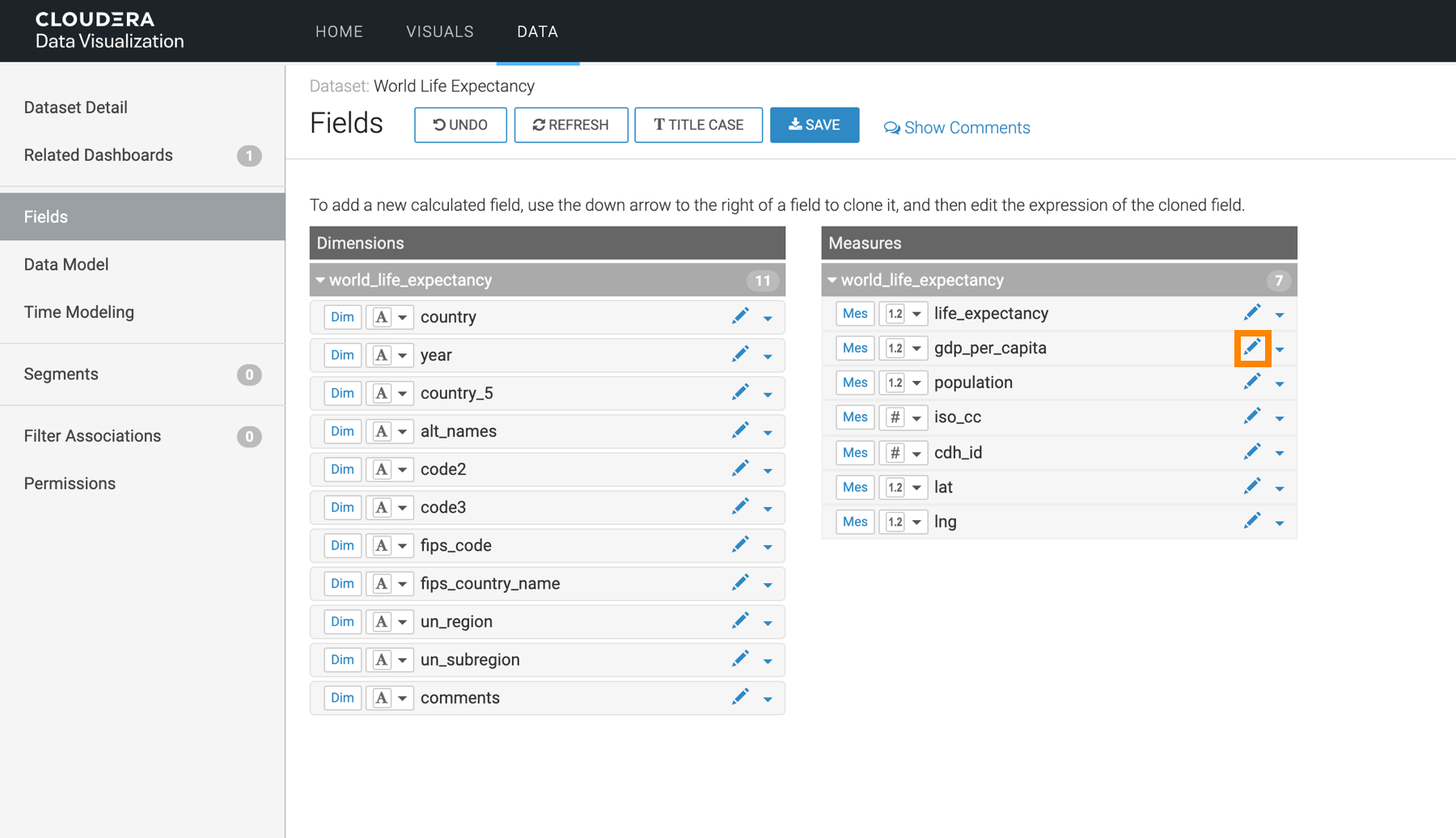 Changing the field display format CDP Data Visualization lets you configure, at the dataset level, the display format of each field. In the World Life Expectancy dataset, click EDIT FIELDS. Under Measures, find the field gdp_per_capita and click the (pencil) icon on its right side. The Edit Field Parameters modal window appears. Click the Display Format tab. Under Display Format, you have several options in the Category menu: None Real Number Integer Percentage Scientific Currency Date/Time Custom Format Custom Javascript For more information, see: Changing currency field display formatIn CDP Data Visualization, you can set currency display options for numerical fields across all visuals of a dataset.Changing custom field display formatIn CDP Data Visualization, you can Set currency display options for numerical fields across all visuals of a dataset.Changing custom Javascript field display formatParent topic: Changing dataset fields