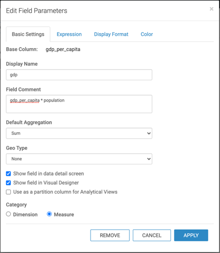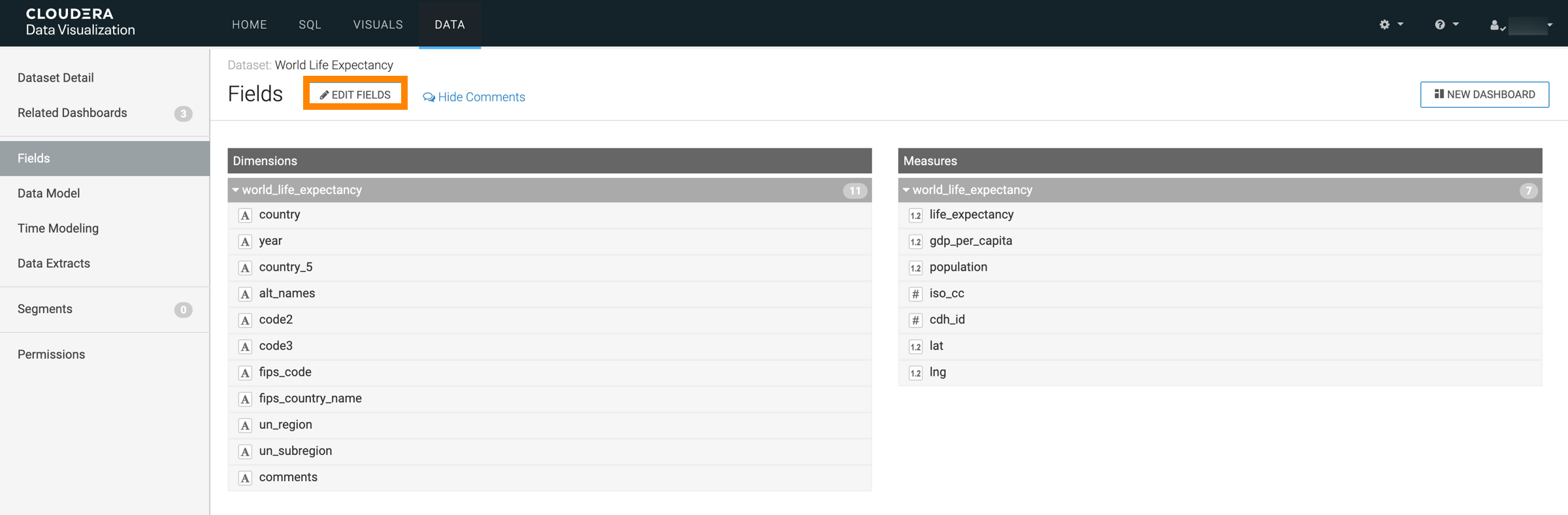 Sometimes, the data in the base tables cannot be used directly, and must use an expression to change or "correct" it. For other use cases, you can create a calculation based on one or more fields. Instead of adding these expression for every visual, in CDP Data Visualization, you can easily create a new calculated field in the dataset, and subsequently use it in dashboards and visuals.