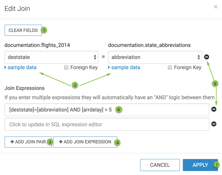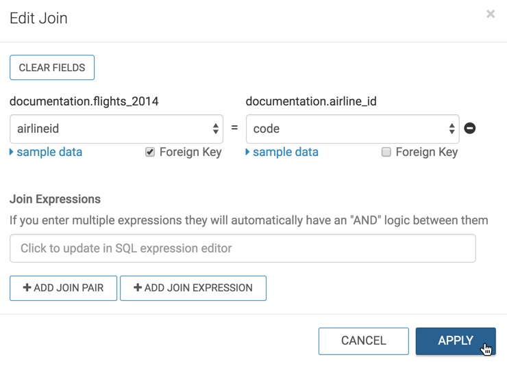 - [Optional] Click Add Join Expression to add a join between the two tables based on a custom SQL expression.