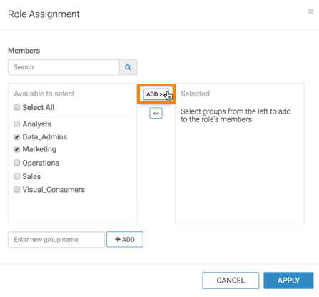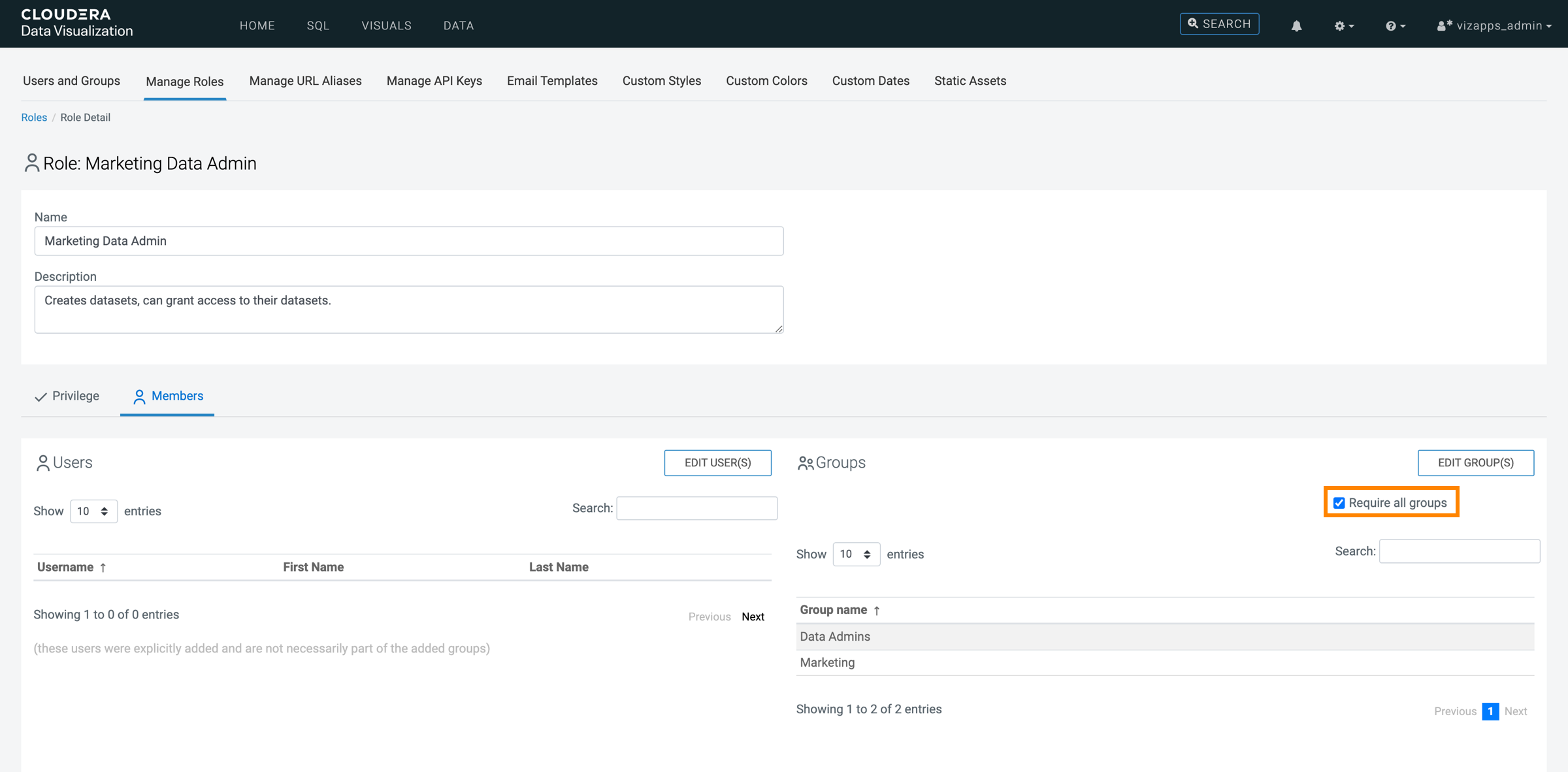 The following steps demonstrate how to create the necessary user groups in Cloudera Data Visualization. Note that depending on your architecture, this definition