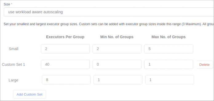 In Custom Set 1, configure executors per group, minimum number of groups, and maximum number of groups.