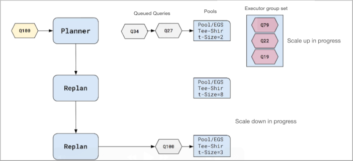 The Impala planner traverses successively larger executor groups iteratively to find one to run the query efficiently. Traversal stops when the planner finds an acceptable executor group set. In Workload Aware Auto-Scaling, this process is called replanning.