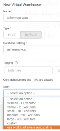 2. In Size, select Use Workload Aware Auto-Scaling.