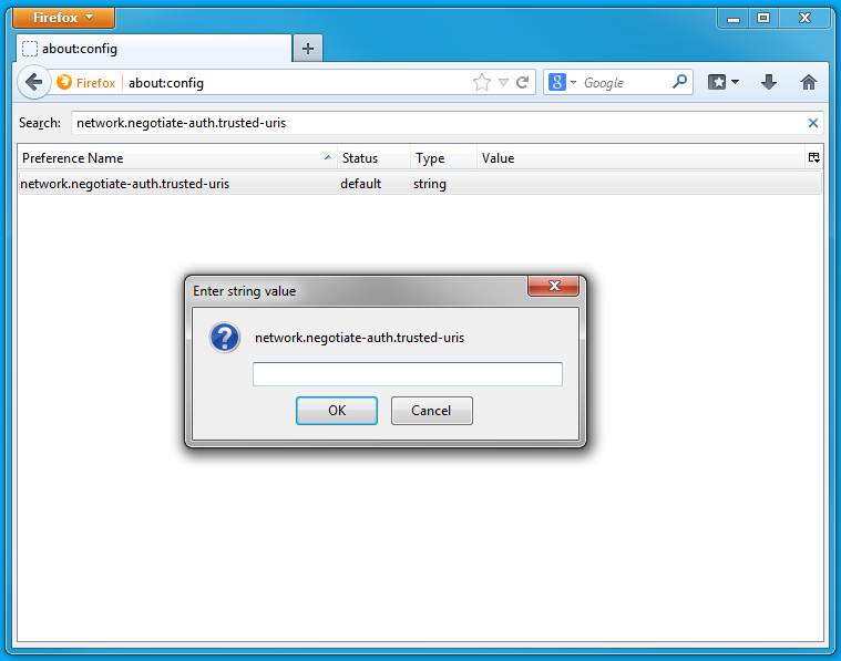 - Double-click the network.negotiate-auth.trusted-uris preference and enter the hostname or the domain of the web server that is protected by Kerberos HTTP SPNEGO. Separate multiple domains and hostnames with a comma.