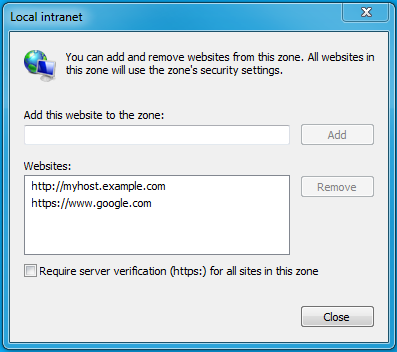 - Click Advanced and add the names of the domains that are protected by Kerberos HTTP SPNEGO, one at a time, to the list of websites. For example, myhost.example.com. Click Close.