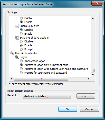 - Scroll down to the User Authentication options and select Automatic logon only in Intranet zone.