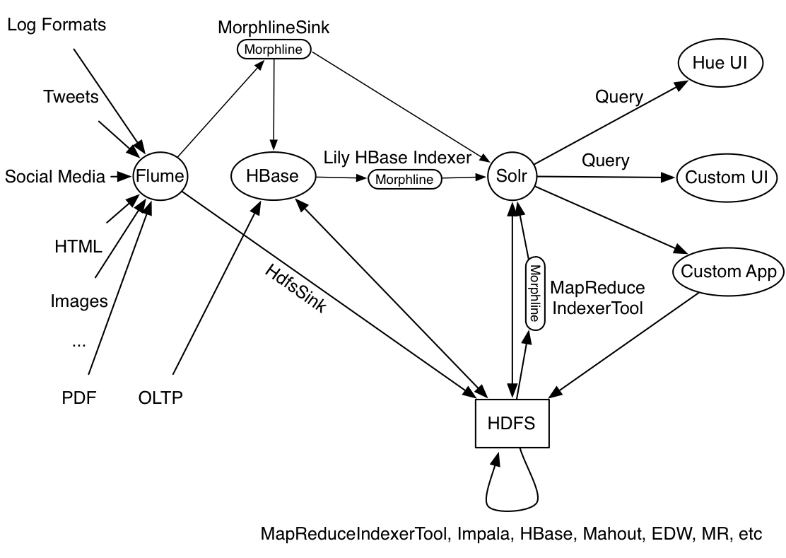 Cloudera Morphlines is an open source framework that reduces the time and skills necessary to build or change Search indexing applications. A morphline is a rich configuration file that simplifies defining an ETL transformation chain. These transformation chains support consuming any kind of data from any kind of data source, processing the data, and loading the results into Cloudera Search. Executing in a small embeddable Java runtime system, morphlines can be used for Near Real Time applications, as well as batch processing applications, for example as outlined in the following flow diagram: