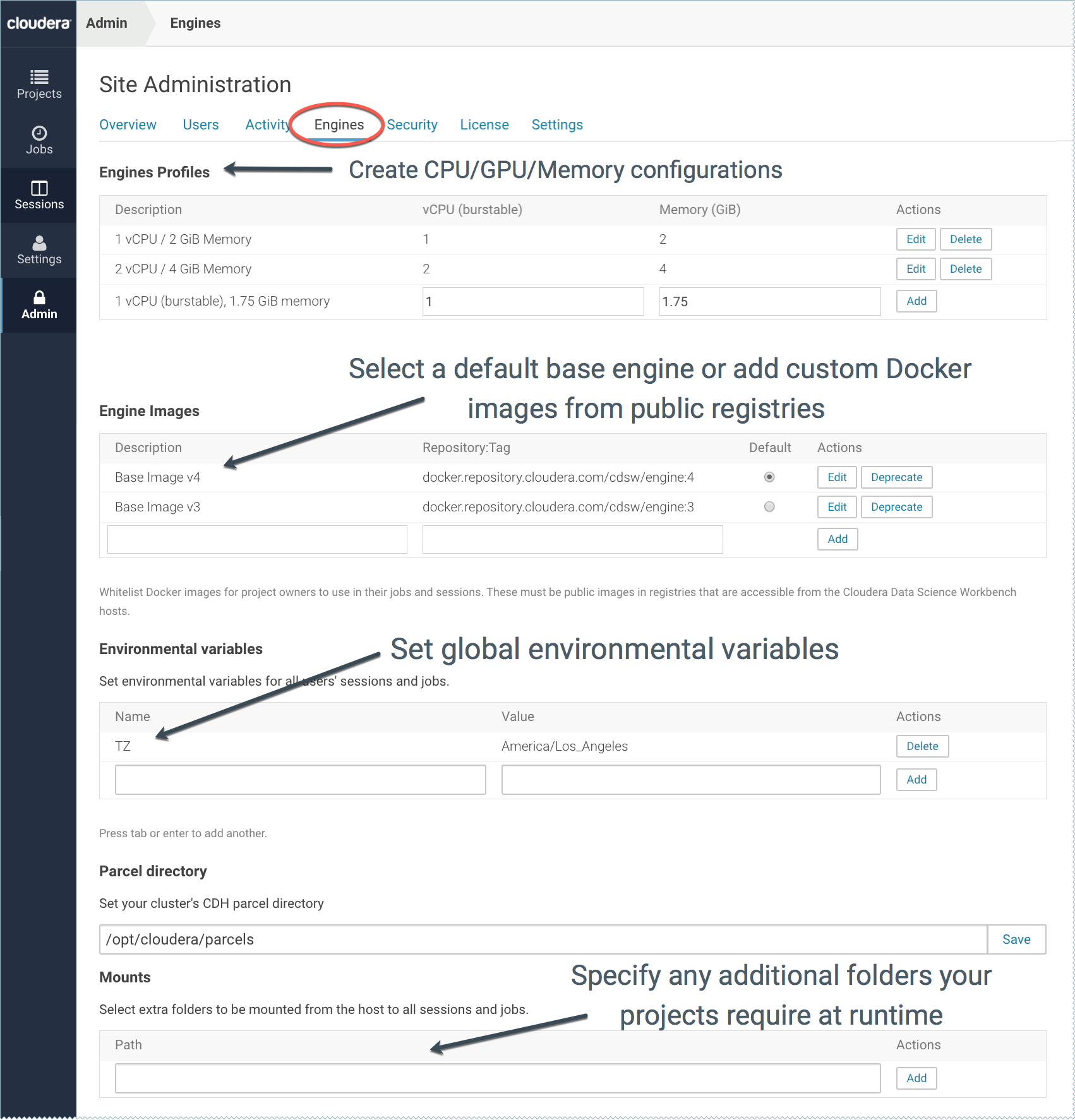 As a site administrator you are responsible for creating engine profiles, determining the default engine version to be used across the deployment, and white-listing any custom engines that teams require. You can also customize the engine environment as needed by setting global environmental variables and configuring any files/folders that need to be mounted into project environments on run time.