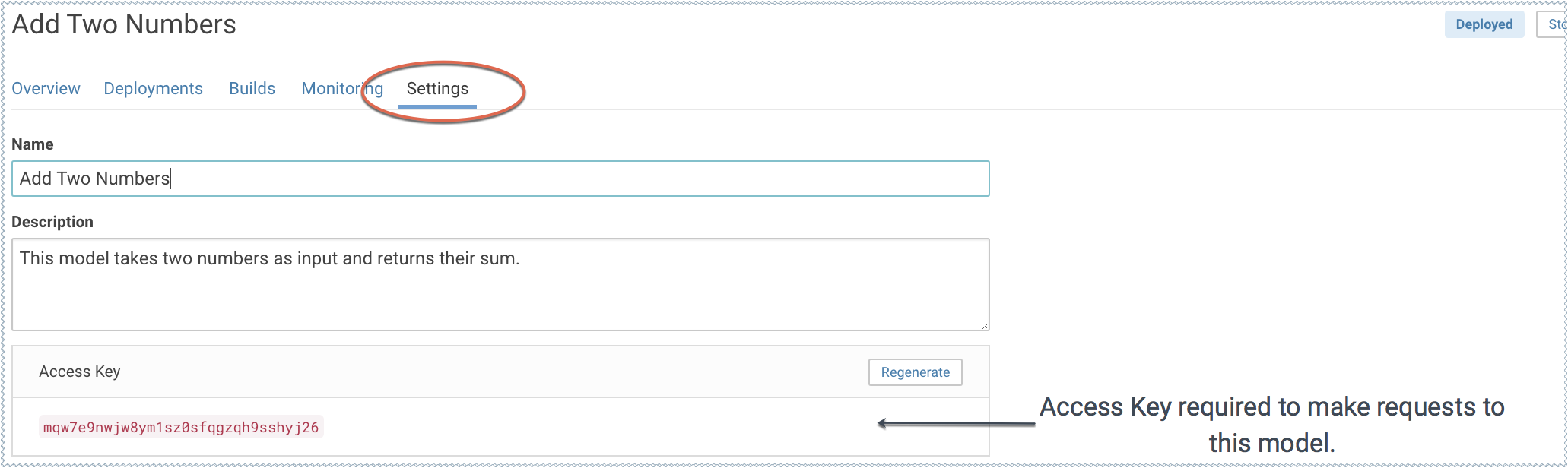 To locate the access key for a model, go to the model Overview page and click Settings.