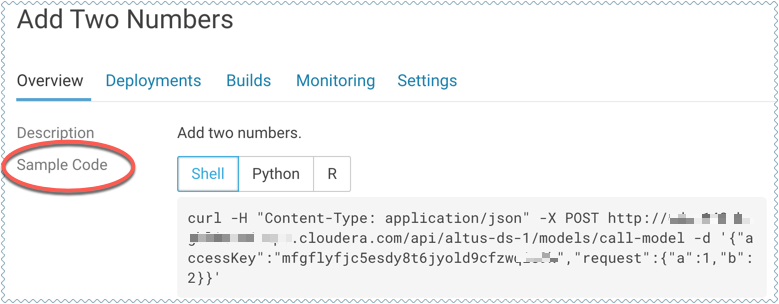 On each model's Overview page, Cloudera Data Science Workbench provides a widget that makes a sample call to the deployed model to ensure it is receiving input and returning results as expected.