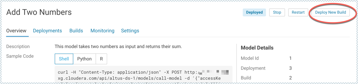 On the model Overview page, Cloudera Data Science Workbench also provides sample curl and POST request strings that you can use to test calls to the model. Copy/paste the curl request directly into a Terminal to test the call.