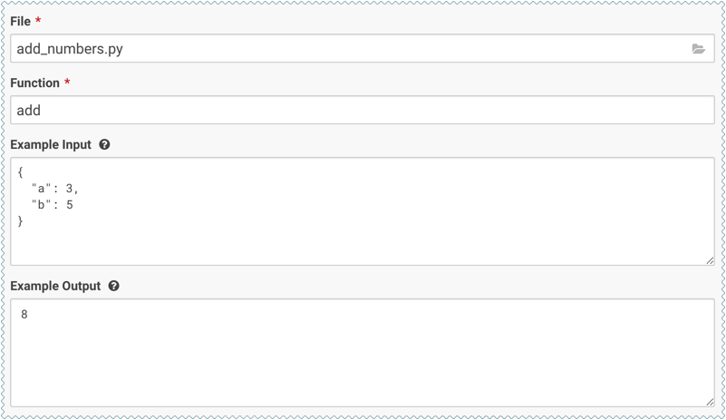 - Function - The function to be invoked inside the file. This function should take a single JSON-encoded object (for example, a python dictionary) as input