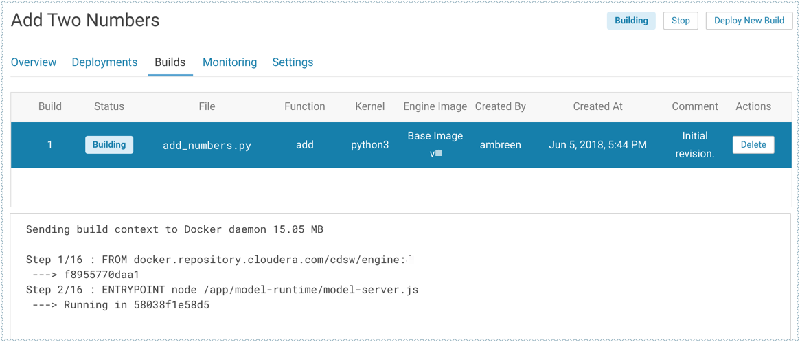 To create the model build, Cloudera Data Science Workbench creates a Docker image based on the engine designated as the project's default engine. This image provides an isolated environment where the model implementation code will run.