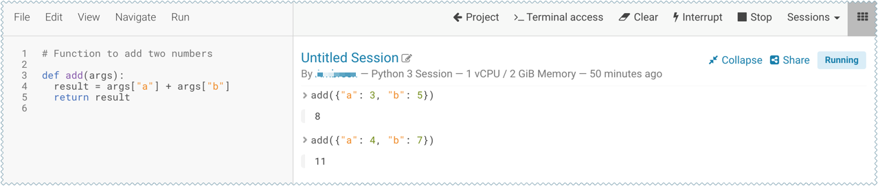For the purpose of this quick start demo we are going to create a very simple function that adds two numbers and deploy it as a model that returns the sum of the numbers. This function will accept two numbers in JSON format as input and return the sum.
