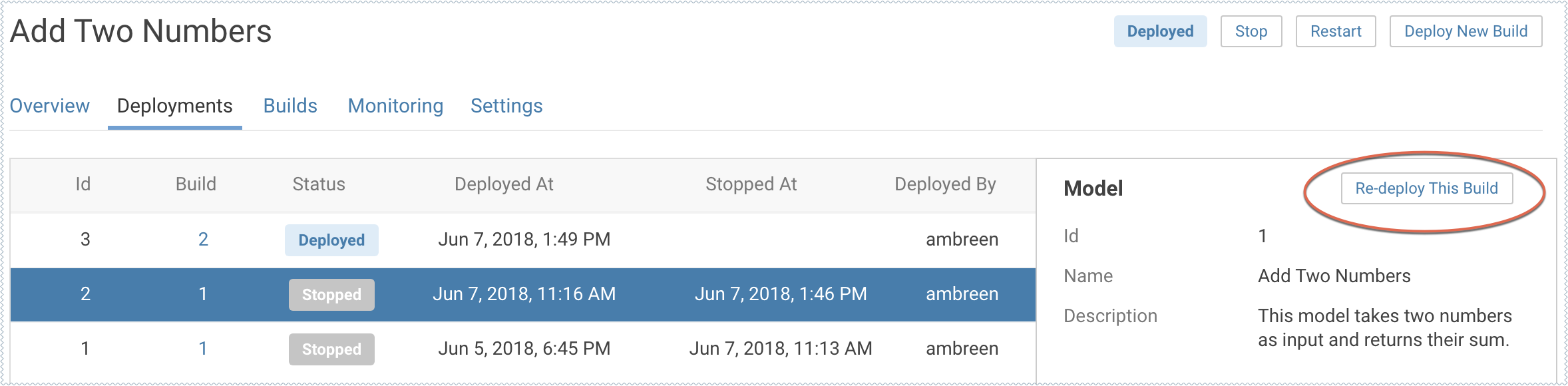 You can make changes to a model even after it has been deployed and is actively serving requests. Depending on business factors and changing resource requirements, such changes will likely range from changes to the model code itself, to simply modifying the number of CPU/GPUs requested for the model. In addition, you can also stop and restart active models.