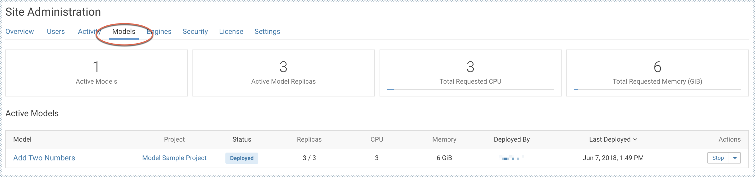 To see a complete list of all the models that have been deployed on a deployment, and review resource usage across the deployment by models alone, go to . On this page, site administrators can also Stop/Restart/Rebuild any of the currently deployed models.