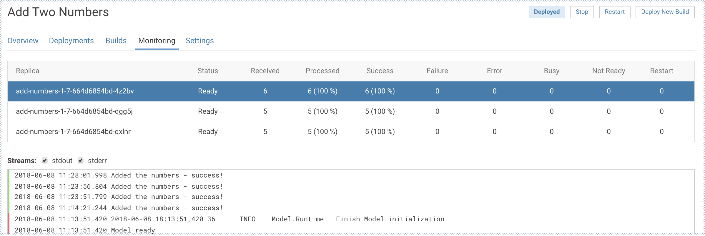The most recent logs are at the top of the pane (see image). stderr logs are displayed next to a red bar while stdout logs are by a green bar. Note that model logs and statistics are only preserved so long as the individual replica is active. When a replica restarts (for example, in case of bad input) the logs also start with a clean slate.