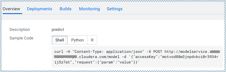 On the model Overview page, Cloudera Data Science Workbench also provides sample curl and POST request strings that you can use to test calls to the model. Copy/paste the curl request directly into a Terminal to test the call.