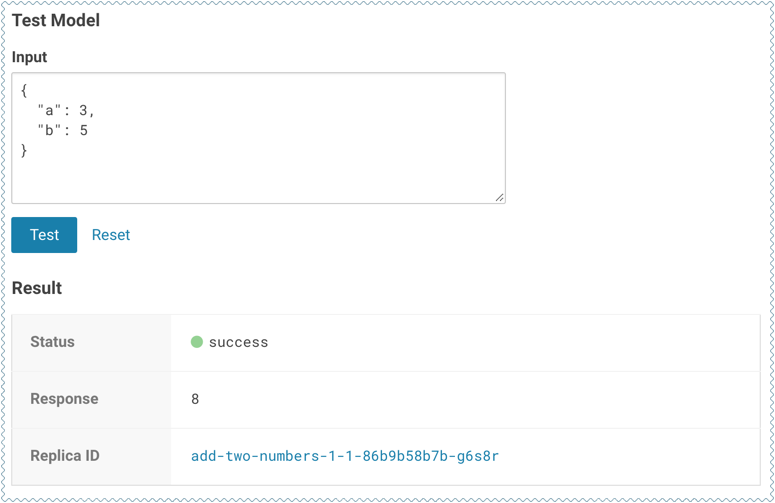 If you entered example input when creating the model, the Input field will be pre-populated with those values. Click Test. The result returned includes the output response from the model, as well as the ID of the replica that served the request.