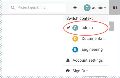 Context changes in the UI are subtle, so if you're wondering where a project or setting lives, first make sure you are in the right context. The application header will tell you which context you are currently in. You can switch to a different context by going to the drop-down menu in the upper right-hand corner of the page.