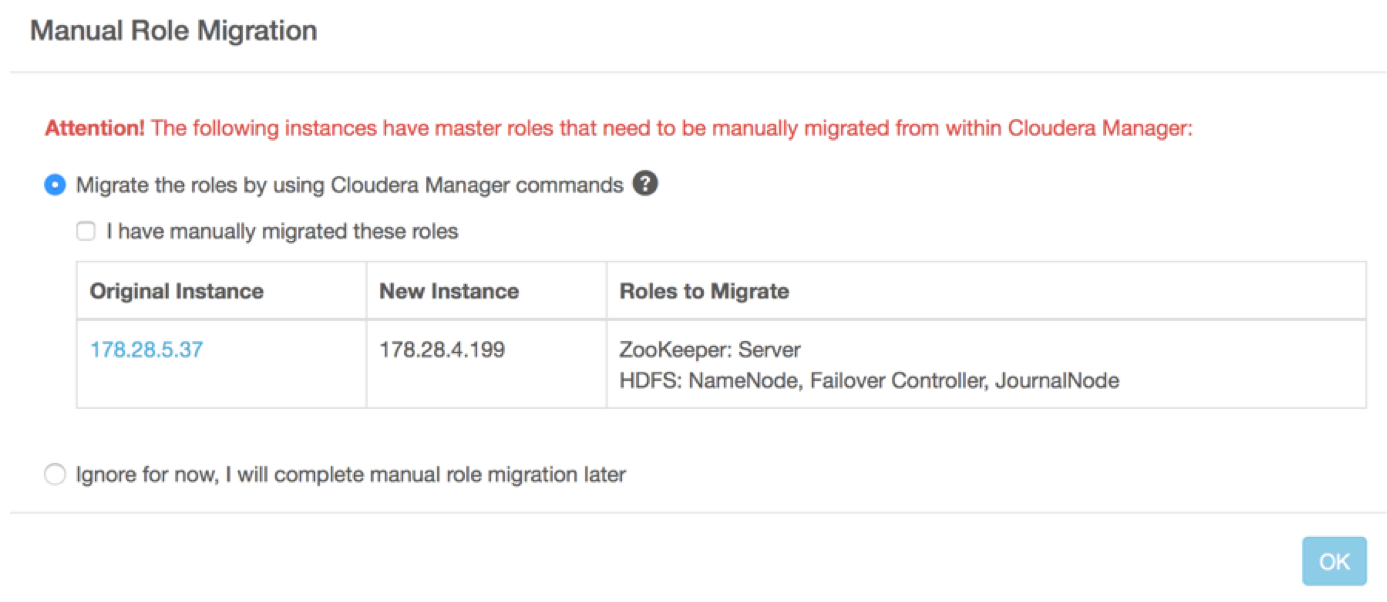 - To complete the migration (Step 3 below), click a checkbox to indicate that the migration is done, after which the old instance is terminated. Check Cloudera Manager to ensure that the old host has no roles or data on it before performing this step in Cloudera Director. Once the old instance is terminated, any information or state it contained is lost.
