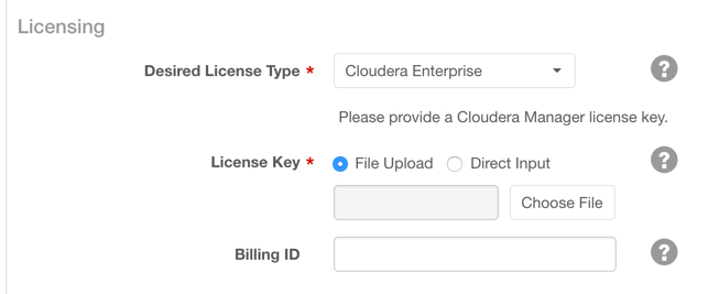 If you choose Cloudera Enterprise, the License Key and Billing ID fields are displayed. The Billing ID field is optional. Enter a valid license key, but do not enter a billing ID if you want your clusters to include Cloudera Enterprise features but without usage-based billing.