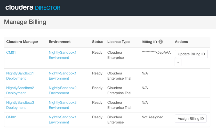 To manage billing IDs for an existing deployment of Cloudera Manager, click Manage Billing on the admin menu in the upper right of the Cloudera Director web UI.