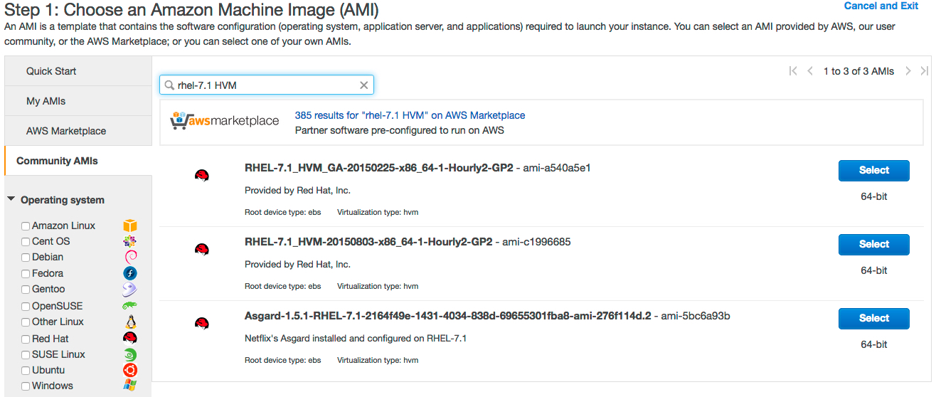 - In the search box, type the desired operating system. For example, if you type rhel-7.1 HVM, the search results show the versions of RHEL v7.1 that