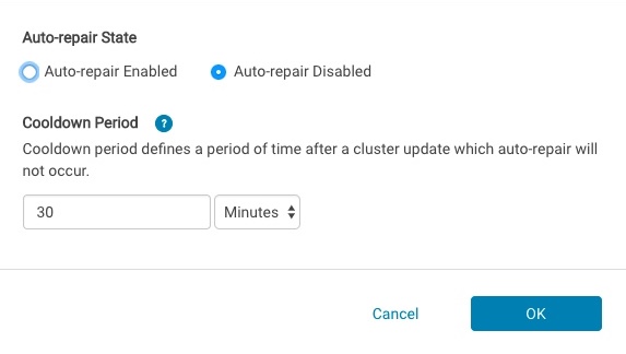 • Auto-repair is disabled by default, and can be enabled (1) when creating a cluster in the web UI, (2) on the web UI page for an existing cluster, or (3) in the configuration file when launching a cluster with bootstrap-remote.